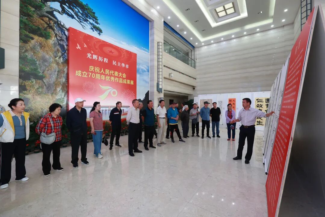 老同志一行来到市人大机关一楼展厅,共同观赏“庆祝人民代表大会成立70周年优秀作品成果展”。大家纷纷表示,人民代表大会走过的70年光辉历程,是中国民主政治发展道路上的伟大史诗,本次展览也充分展示了九江市坚持和完善人民代表大会制度取得的重要历史成就。
